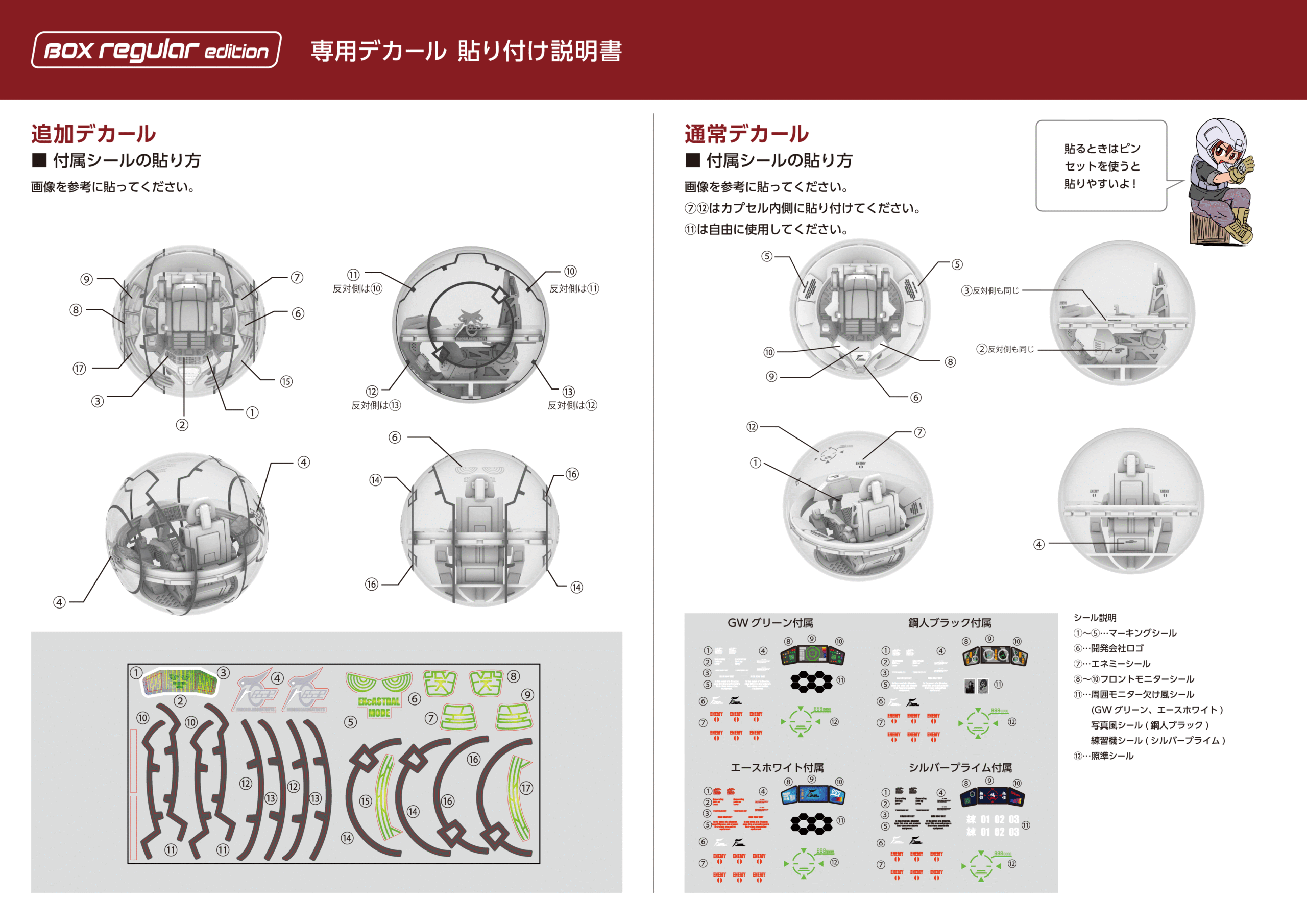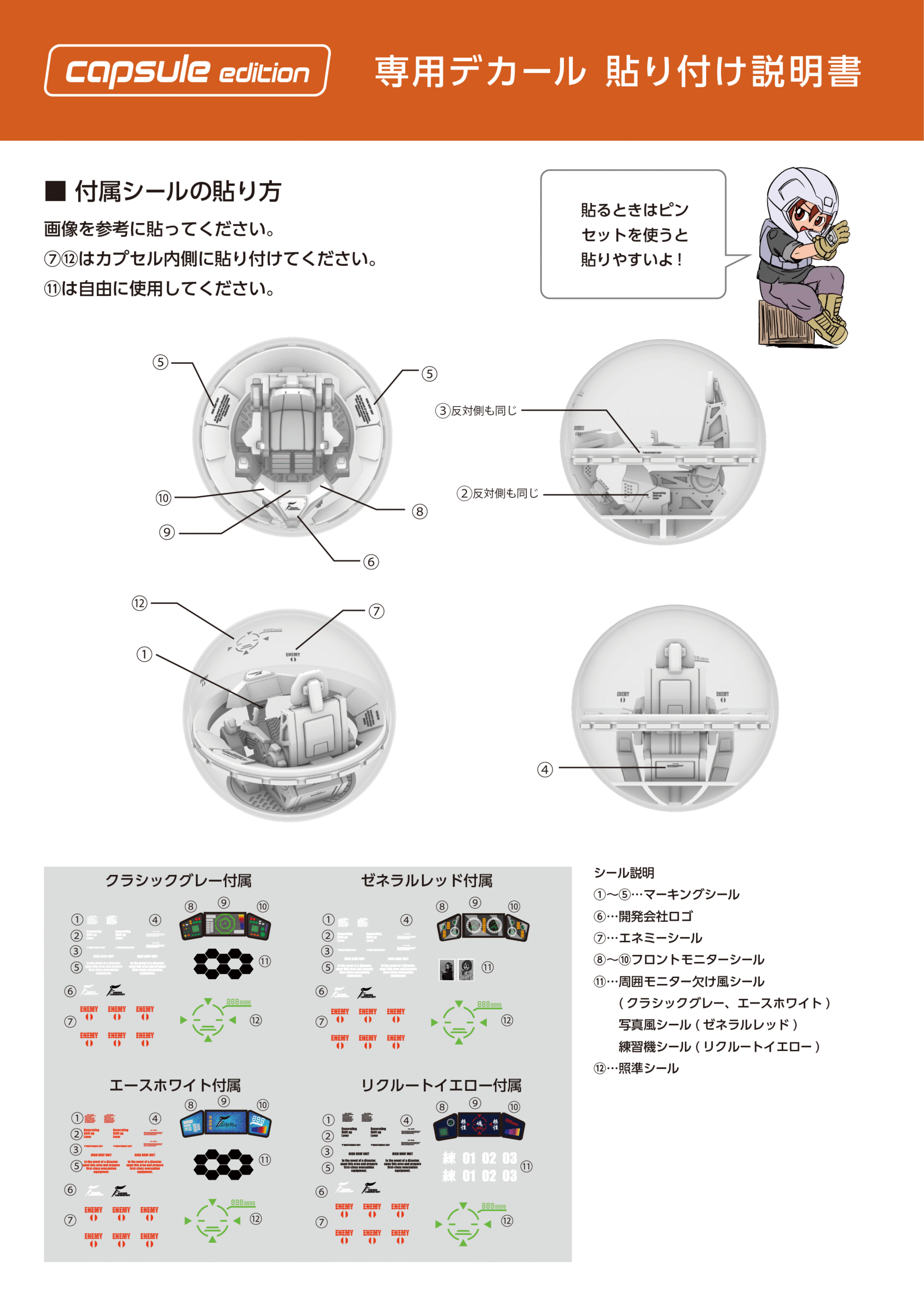 「カプセルコックピット Type FO-6532」各エディションのデカール貼り付け位置をまとめた画像を公開しました。組み立ての際にご参照ください。
